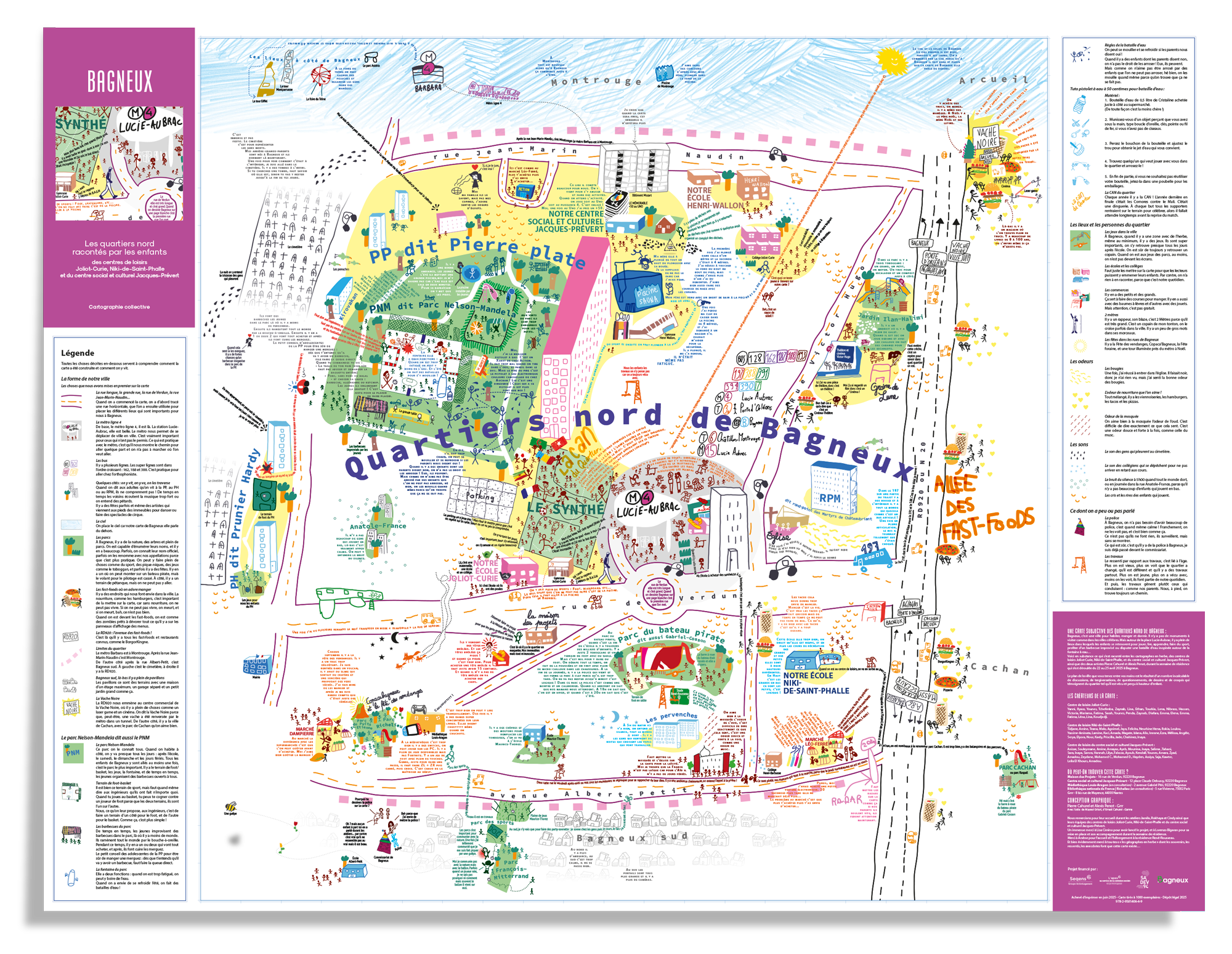 C’est cette vision plus vivante et sensible de la ville qui a donné naissance à la carte subjective de Bagneux. Imaginée à la demande de la Maison des Projets, grâce à Lisa Cimino et Lorenzo Bigaran, elle a été réalisée par Pierre Cahurel et Alexis Penot avec l’aide précieuse des géographes en herbe des centres de loisirs Joliot-Curie et Niki-de-Saint-Phalle, ainsi que du centre social et culturel Jacques-Prévert.
