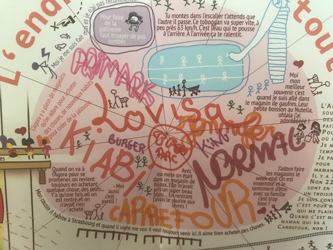 La carte, elle devrait raconter plus d’anecdotes comme ça ils comprennent notre vie. Notre vie c’est des anecdotes. Après ils vont venir habiter à Evry-Courcouronnes et après il y aura beaucoup de monde. Ce sera mieux parce que c’était calme, ils vont construire plus de terrain de jeux.